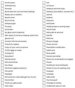 Of course you don't have to have every single item on this checklist, it's mainly just to make sure you have everything covered. For example, if you're going to a hotel to get ready, they will probably have an iron, but it was worthy putting on here just in case you aren't going to a hotel.